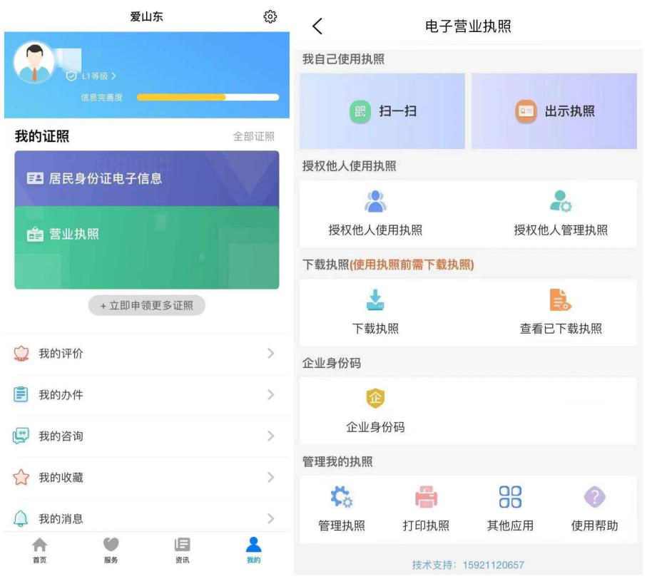 方法三:使用“爱山东”APP下载“电子营业执照”